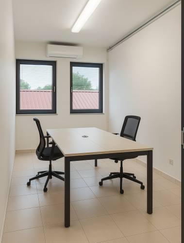 Ufficio luminoso e funzionale da circa 13 m², ideale per 1 o 2 postazioni. È arredato con una scrivania ampia e due sedute operative, pavimento e pareti neutre che lo rendono facilmente personalizzabile. Dispone di due finestre che garantiscono luce naturale e aerazione, climatizzatore a parete e illuminazione lineare a soffitto; sul lato destro è presente un’ampia parete libera/ schermata, utile per proiezioni o per attrezzare una zona archivio.