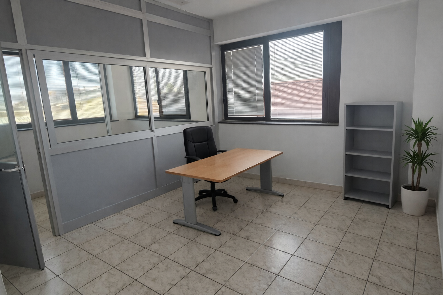 Ufficio luminoso e ben organizzato, caratterizzato da una divisione in due zone distinte (10,93 m² e 16,85 m²) grazie a una parete vetrata e ad una porta di separazione. Questa configurazione lo rende ideale per gestire attività differenti in ambienti separati (ad esempio area operativa e area riunioni, amministrazione e commerciale, postazione tecnica e spazio clienti), mantenendo ordine, privacy e una buona comunicazione visiva. L’ambiente è arredato con scrivania operativa, sedia direzionale e una libreria/archivio. Le ampie finestre garantiscono luce naturale e aerazione, mentre finiture e colori neutri lo rendono facilmente personalizzabile in base alle esigenze.